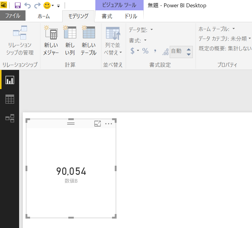 そのころの対応は、いったんデータに戻って、その列(フィールド)に対して「桁区切り記号」をつけていました。データ側の列に桁区切り記号をつけると、レポートのビジュアルの数値も桁区切り記号がつきます。